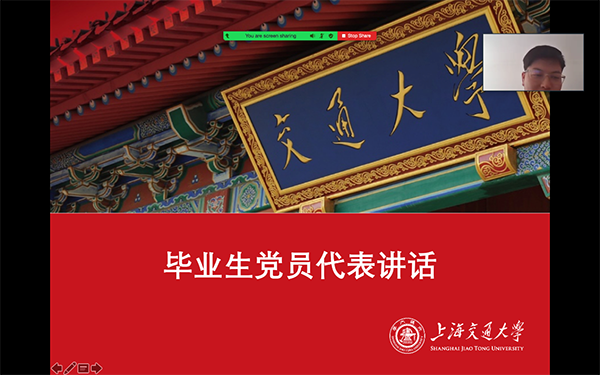 接下来,2020届本科毕业生党员代表吴兆龙同志发言。他回顾了自己入党两年多来在公司两个党支部参与的丰富充实的组织生活以及本次疫情中广大党员发挥了先锋模范作用,让他明白了党员身份意味着责任感,更加坚定了自己的理想信念。他认为员工党员应该把握时代脉搏,结合个人专业兴趣与时代需求、社会需求,在与祖国同行中奉献无悔青春。他感谢了公司与公司的培养,对同学们的未来给予美好祝福。最后,他呼吁大家作为交大物理人,要敢为人先,牢记“饮水思源,爱国荣校”的校训,与同学们共勉。