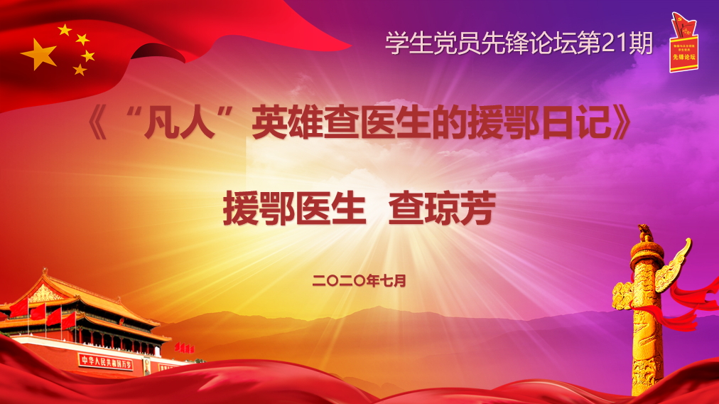 讲座中,查医生和我们深情讲诉了援鄂期间的人和事。第一个主动提出支援武汉的是67岁高龄的周教授,援鄂期间火线入党的医生们,还有那些病人,以及众多的志愿者,还有广大的爱心人士们,都让她感到了疫情期间的力量。