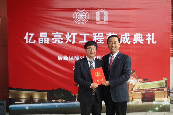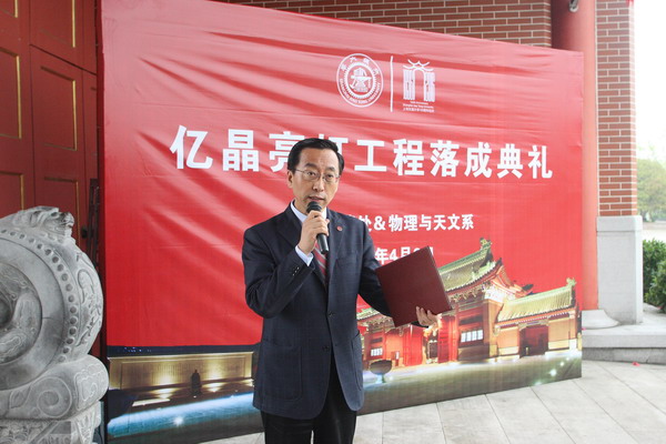 张杰对亿晶光电公司为交大校园环境建设所作出的贡献表示衷心的感谢,并回顾了亿晶光电公司与交大源远流长流长的合作关系。在亿晶光电公司发展过程中,交大在技术与人才方面给予了大力支持,在亿晶光电公司发展壮大后,也不忘反哺教育、支持交大发展。亿晶光电公司2008年设立“亿晶光电人才基金”,值交大双甲子华诞之际,公司董事长荀建华先生又捐赠人民币120万元兴建“亿晶亮灯工程”,助力交大校园建设。张杰表示自己一直致力于创建更加节能环保的大公司园和科研环境,希望交大继续与亿晶光电公司保持科研与人才合作,实现多方共赢的良好局面。最后,张杰号召物理与天文系的同学们努力学习相关科技领域的知识,以员工为榜样,为今后的科学发展和人类服务做出自己应有的贡献。随后,张杰代表公司向亿晶光电公司颁发了捐赠证书。
