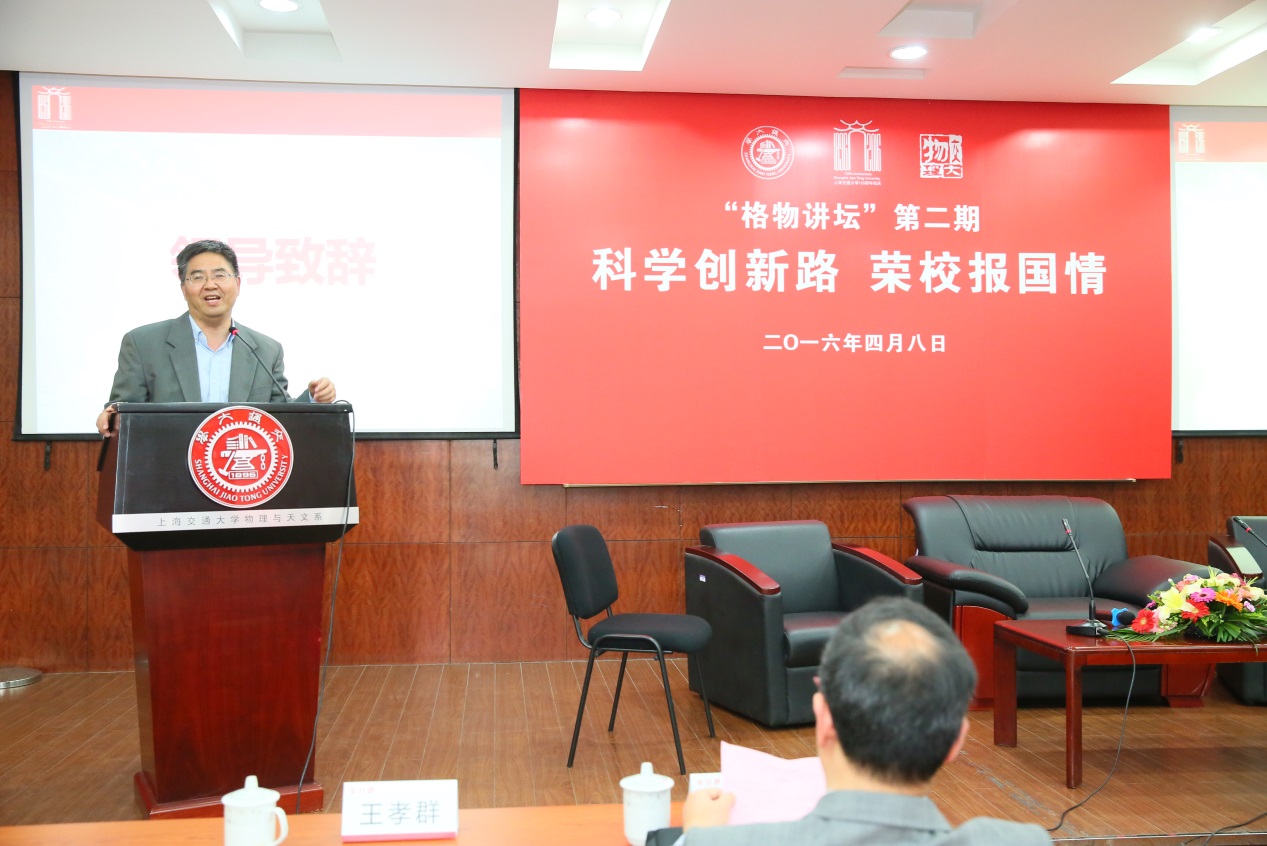 系主任王孝群教授致欢迎辞,并代表物理与天文系对三位院士的成就表示敬意,对他们的到来表示感谢和欢迎,并希望到场同学珍惜机会,向院士们学习。