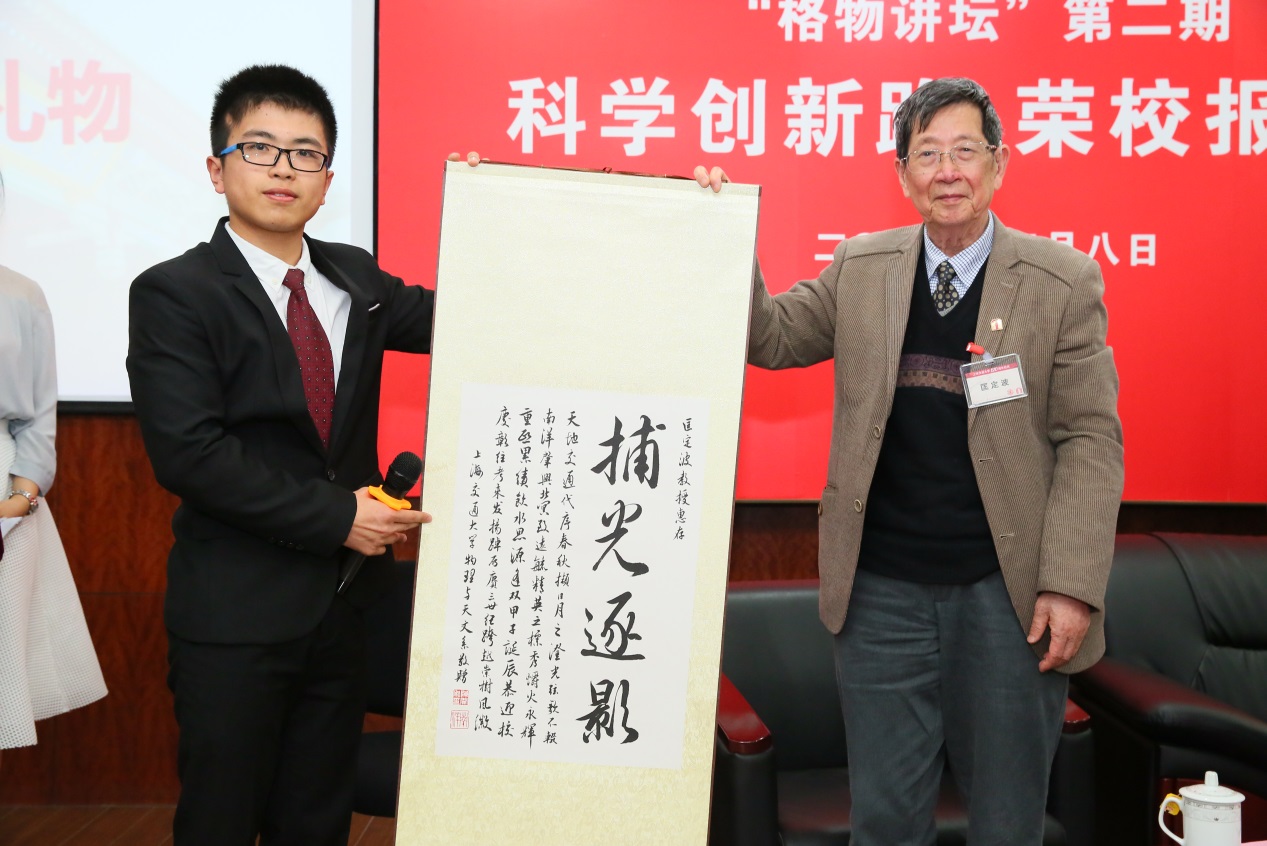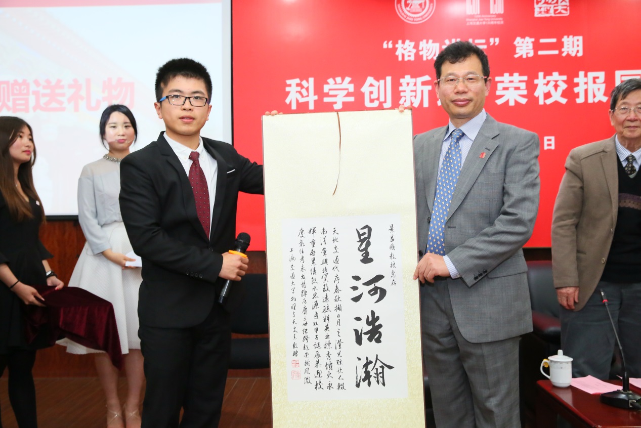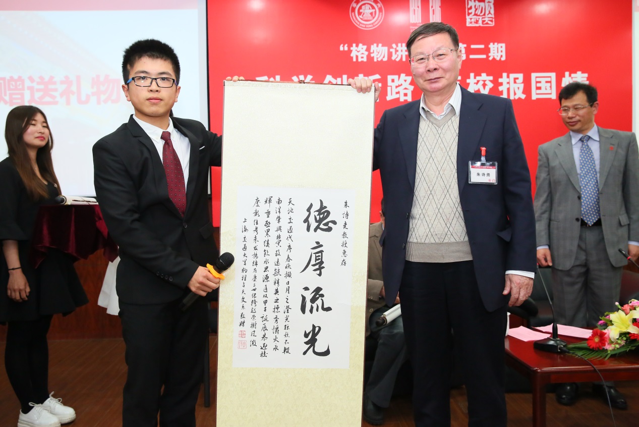 最后,为表示深切感谢,物理与天文系为三位院士献上了别特的礼物——三幅书法作品,作品根据三位院士的研究领域分别选取不同的成语,分别是“捕光逐影”、“德厚流光”与“星河浩瀚”。书法作品由物理与天文系大三员工陈开亲手绘制,表达了青年物理学子们对于三位前辈的崇敬和爱戴。