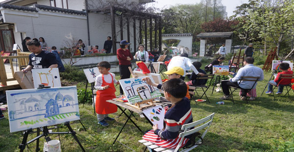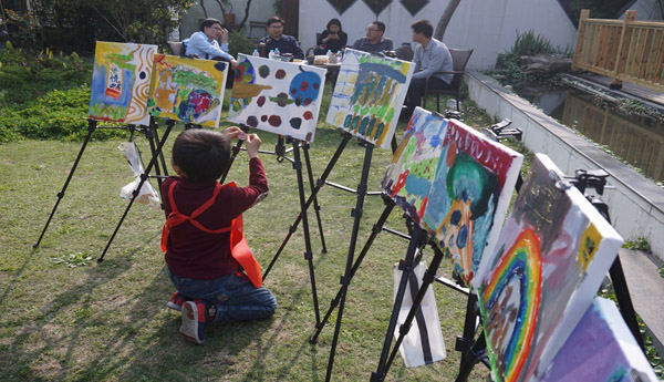随后由思南画社的老师们为“交二代”准备画板、调色盘、画笔、溶解剂、反穿衣等工具。准备完成后,指导老师讲解油画写生的流程、色彩与构图的关系、不同画笔的特点用途、以及一些画画的注意事项。在家长与志愿者们的协助下,“交二代”们迅速掌握了绘画的技巧并开始了他们的创作,既有一笔一画认真描绘所看到的景致的,也有展开天马行空的想象肆意挥洒画笔的,还有在父母的指导下临摹名家名作的。与此同时,员工家长们也围坐在庭院中,共同回忆昔日的校园生活。